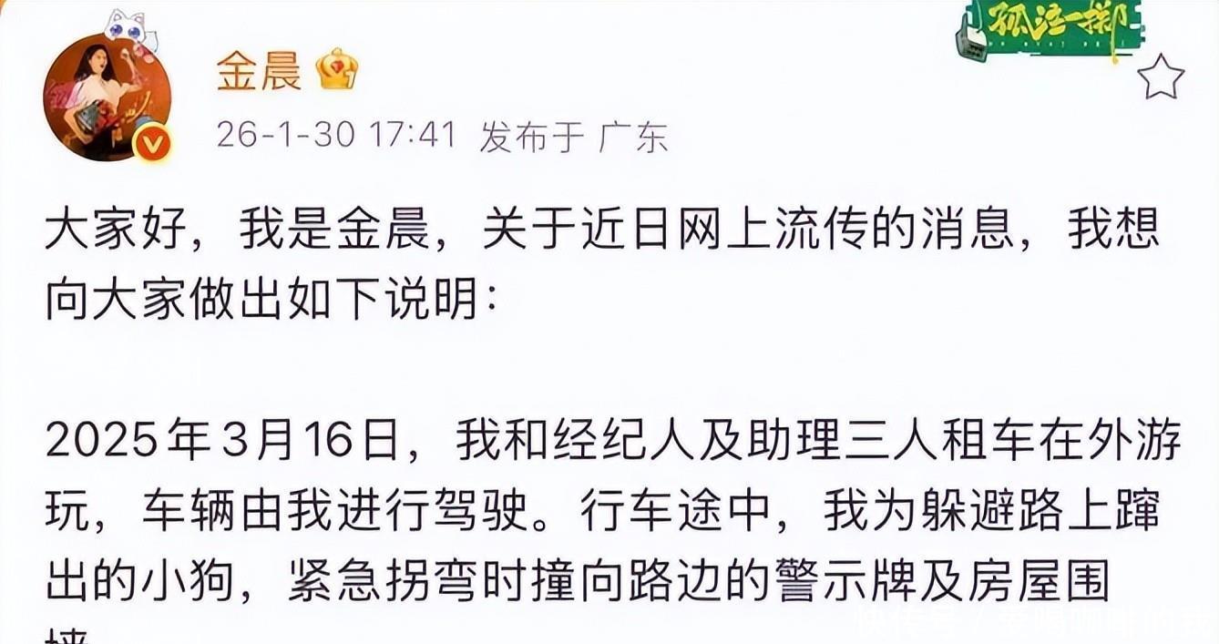 通报内容却让人瞠目,最离谱的传言竟然是真的。事实就是金晨驾驶一辆轿车在行驶中为避让突然窜出的狗而失控,撞上路牌和村民围墙。车辆受损,车内三人受伤,驾驶员金晨,排除酒驾嫌疑。