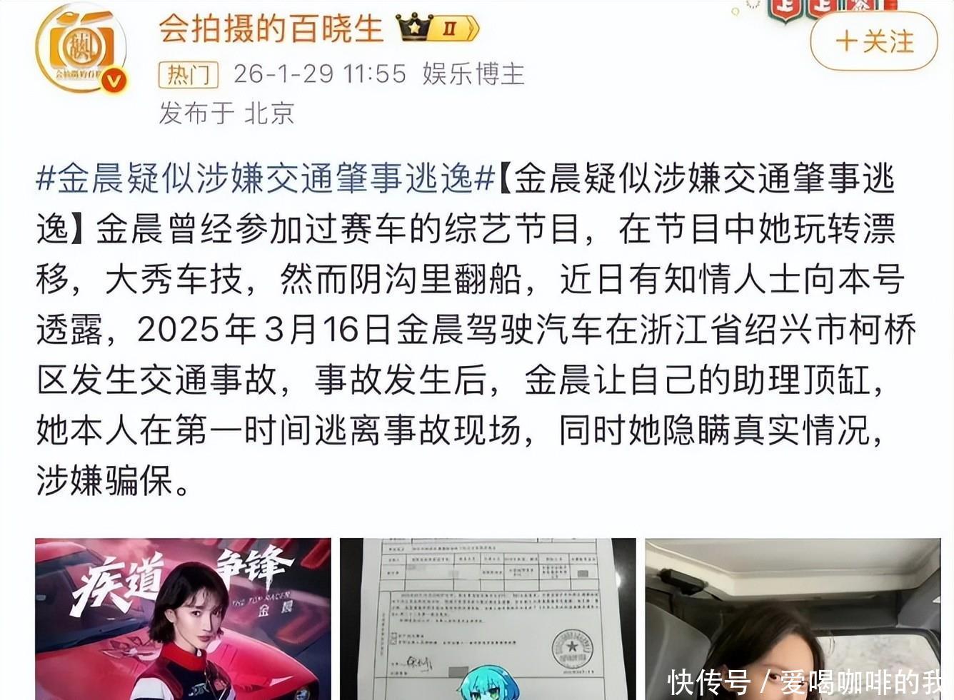 娱乐圈祸不单行不得不说,现在整垮一个明星太简单了。几个娱乐八卦号像约好了一样,同时发了一条重磅消息。金晨被曝出日,在浙江绍兴柯桥区开车出了事故。
